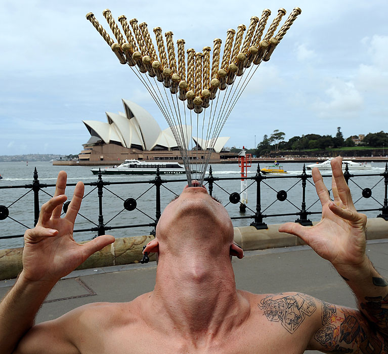 2月8日,街頭藝人Chayne Hultgren在澳大利亞悉尼海港大橋前,一次吞下18把厚約1.3厘米,長約50.8厘米的長劍,刷新了吉尼斯世界紀錄。圖片來源:中國新聞網