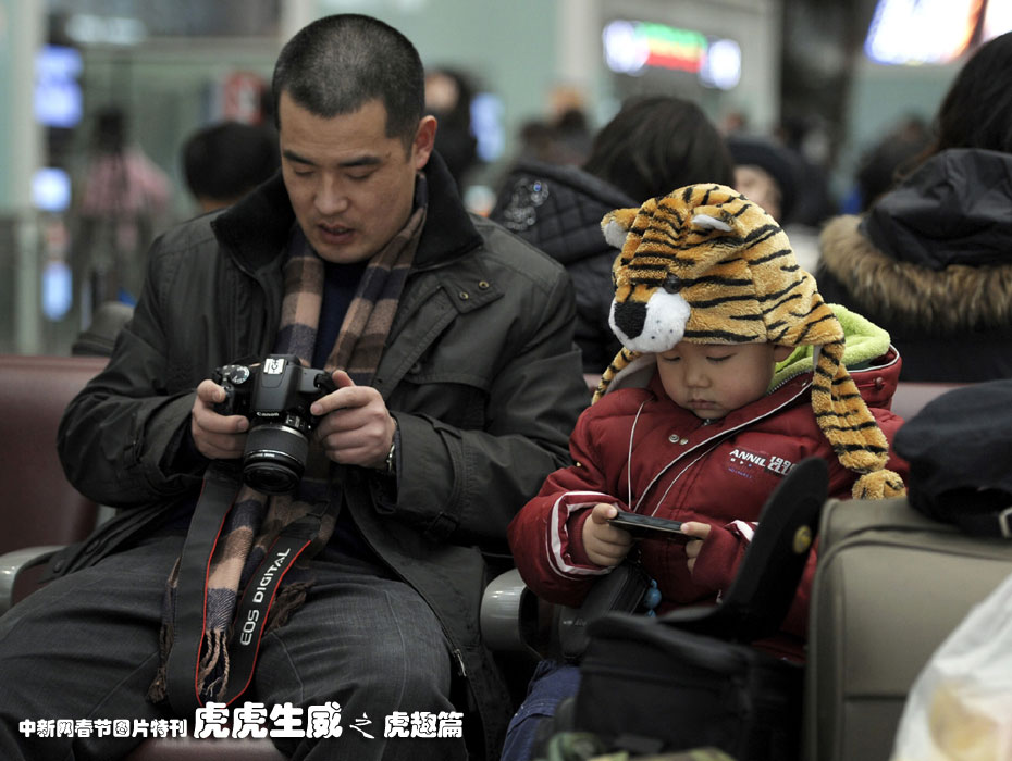 2月7日,北京南站一名頭戴虎帽的孩子和父親在等待回家的火車。