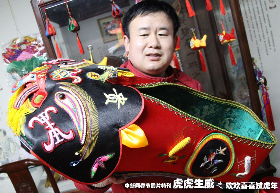 1月18日,南京民間藝人高勇與父母一起花費三個月時間制作了一只長80厘米、高35厘米的虎頭鞋,日前亮相南京市民俗博物館。據悉,改鞋共用絲綢3.5米,耗費金絲線、絲線和棉線約750米。中新社發 阿董 攝