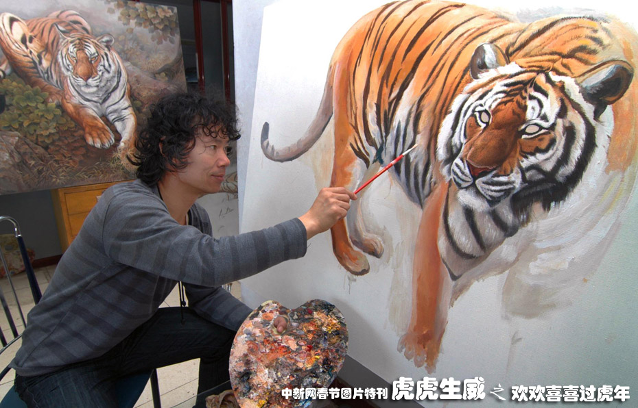 12月15日,遼寧省凌海市新莊子鄉(xiāng)禮中村的返鄉(xiāng)農(nóng)民工劉玉紅利用打工時(shí)學(xué)到的畫畫技藝,回鄉(xiāng)自主創(chuàng)業(yè)。他把中國(guó)畫傳統(tǒng)技法與油畫結(jié)合,創(chuàng)作一系列以“虎”為主題的作品,被不少國(guó)內(nèi)外美術(shù)愛好者收藏,成功實(shí)現(xiàn)再就業(yè)。中新社發(fā) 李鐵成jz 攝