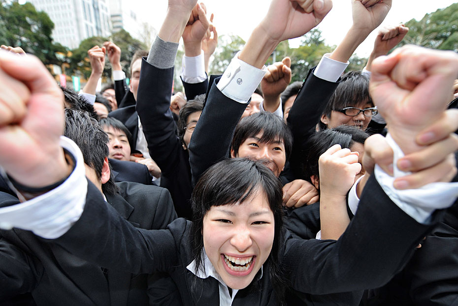 2月10日,日本東京職業(yè)學(xué)校的學(xué)生在求職動(dòng)員會(huì)上伸出拳頭展現(xiàn)信心。日本的失業(yè)率達(dá)5%,2011屆畢業(yè)生將面臨嚴(yán)峻就業(yè)形式。圖片來源:中國新聞網(wǎng)