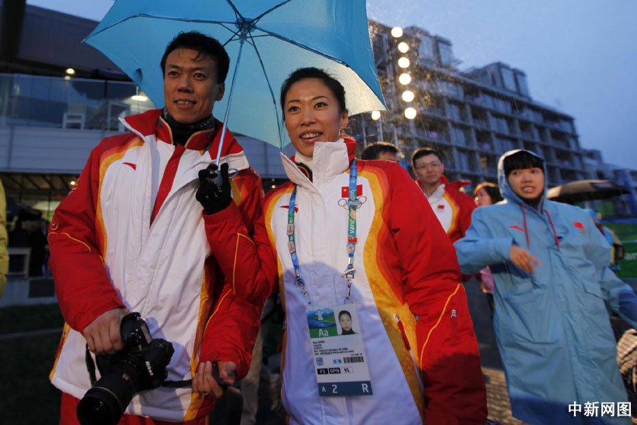 圖為申雪、趙宏博參加升旗儀式。