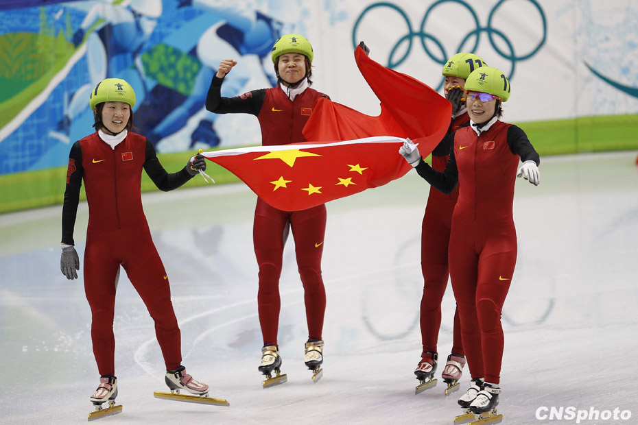 當地時間2月24日,溫哥華冬奧會女子短道速滑3000米接力A組決賽中,中國隊王濛、周洋、孫琳琳、張會四朵金花聯袂出擊,最終將金牌歸入中國隊囊中。圖片來源:中國新聞網