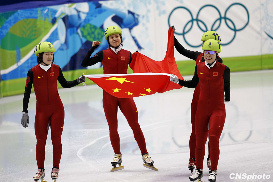 當地時間2月24日,溫哥華冬奧會女子短道速滑3000米接力A組決賽中,中國隊王濛、周洋、孫琳琳、張會四朵金花聯袂出擊,最終將金牌歸入中國隊囊中。圖片來源:中國新聞網