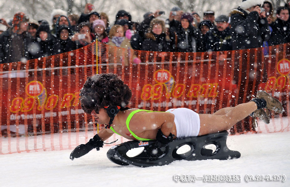 在德國北部小鎮舉行了一場別開生面的滑雪大賽,參賽者在冰天雪地中赤裸著上身在滑雪板上滑行。圖片來源:中國新聞網>>點擊觀看詳細內容