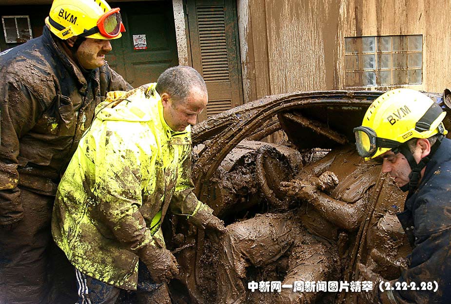 22日(周一),在葡萄牙馬德拉島豐沙爾市,救援人員在移出車廂內的遇難者遺體。當地政府表示,由洪災引發的泥石流導致42人死亡,32人失蹤。