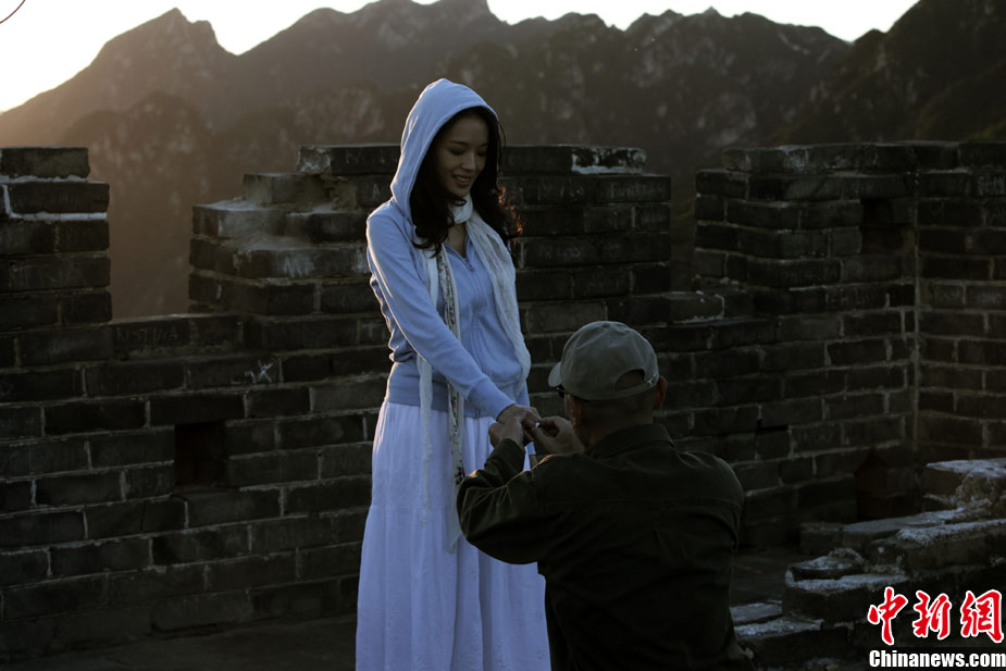 由華誼兄弟出品,馮小剛導演,王朔、馮小剛聯合編劇的《非誠勿擾2》將于12月22日上映。馮氏賀歲電影時隔兩年卷土重來,幽默情調不變,浪漫情懷升溫。近日,華誼兄弟發布了秦奮向梁笑笑求婚的劇照。長城上夕陽下,葛優單膝跪地手舉鉆戒,舒淇笑臉相迎,在《非誠勿擾2》中上演了一場最浪漫的求婚。據悉,為了完成這場求婚戲,全劇組連續拍攝兩天才達到馮小剛導演的要求。 中新社發 fcwr 攝