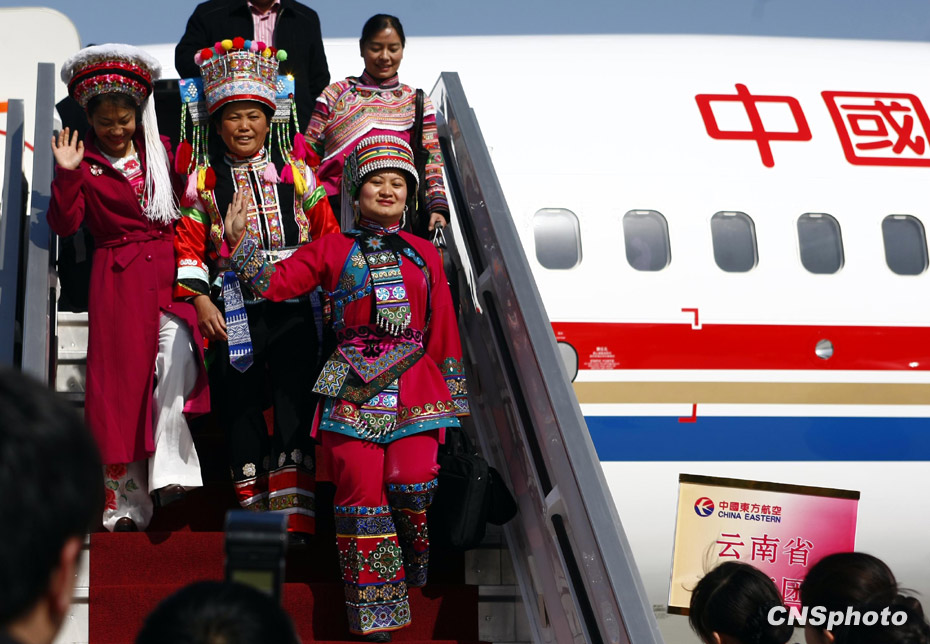 3月2日,參加全國兩會的代表、委員陸續抵達北京。圖為云南代表團的少數民族代表盛裝抵京。中新社發 杜洋 攝