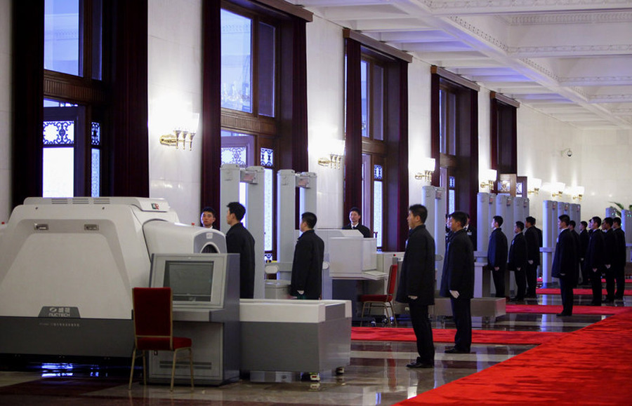 3日下午,全國政協十一屆三次會議將在北京人民大會堂開幕,2010年全國“兩會”由此正式揭開大幕,目前各項工作準備就緒。圖為人民大會堂的主要入口處的安保人員。Feng Li 攝
