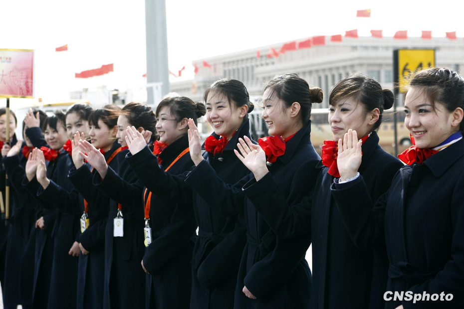 3月2日,禮儀小姐在首都機(jī)場等候迎接抵京參加全國兩會的代表、委員。中新社 發(fā) 杜洋 攝