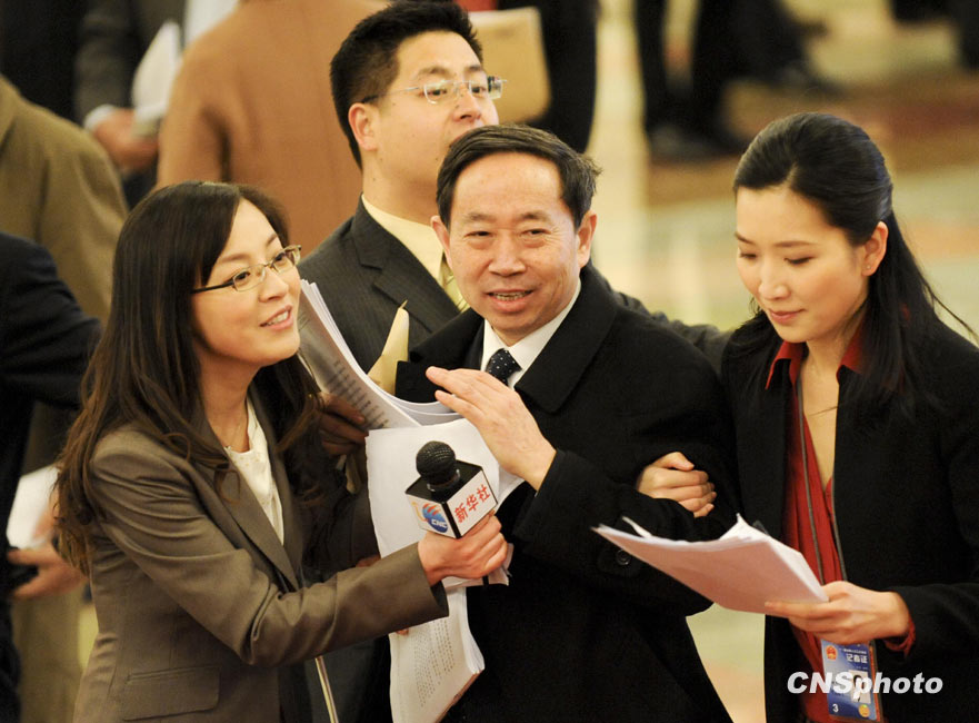 3月5日上午9時,十一屆全國人大三次會議在北京隆重開幕。國務(wù)院總理溫家寶作政府工作報告。圖為教育部長袁貴仁進場時受到記者爭相采訪。中新社發(fā) 廖攀 攝