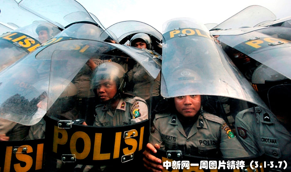 3月3日,印度尼西亞首都雅加達國會門外,警察用盾牌保護自己免受反政府示威者投擲的石塊的傷害。圖片來源:中國新聞網