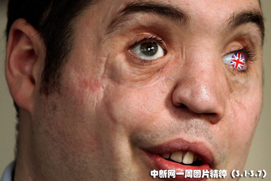 3月1日,威廉王子訪問了威爾士蘭迪德諾的一所康復中心。現年31歲的西蒙•布朗戴上裝飾有英國國旗的假眼歡迎威廉王子。西蒙在2006年的伊拉克巴士拉服兵役期間被狙擊手擊瞎了左眼。圖片來源:中國新聞網