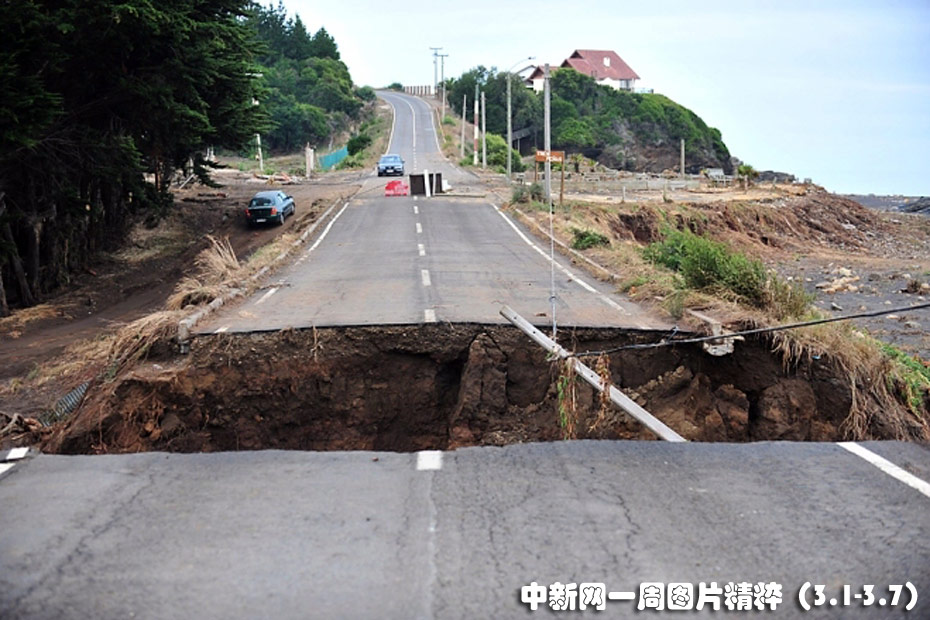 3月2日,在智利佩尤韋,一條公路發生斷裂。智利大地震已過去3天,目前已有至少796人喪身。智利總統巴切萊特稱,部隊已經部署到位。此外她還會見了美國國務卿希拉里•克林頓。政府部門已經開始分發食物。圖片來源:中國新聞網