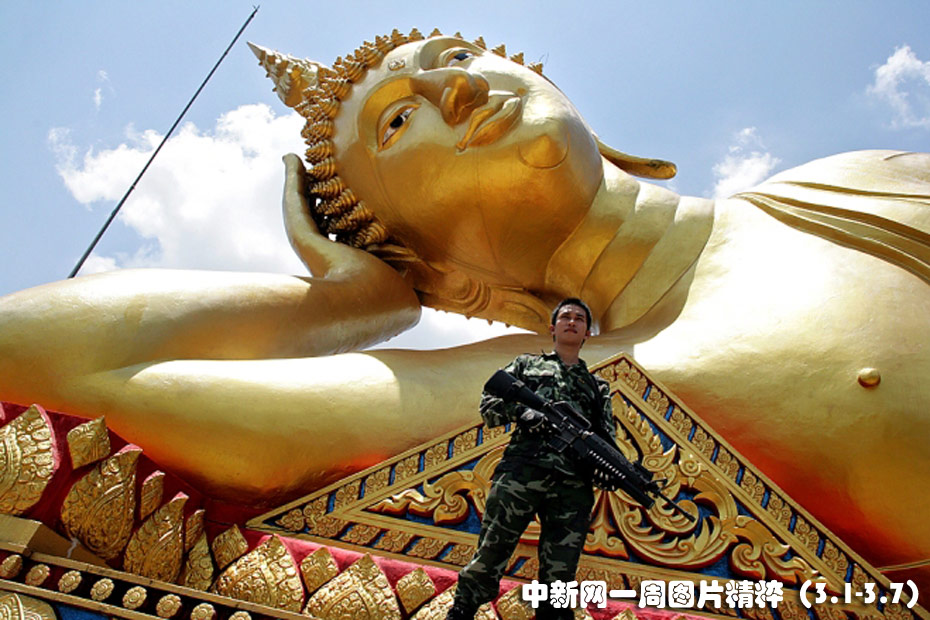 3月4日,在泰國也拉府的一所寺廟中,一名士兵持槍站在一尊佛像前,確保寺廟在動蕩中不受損害。圖片來源:中國新聞網