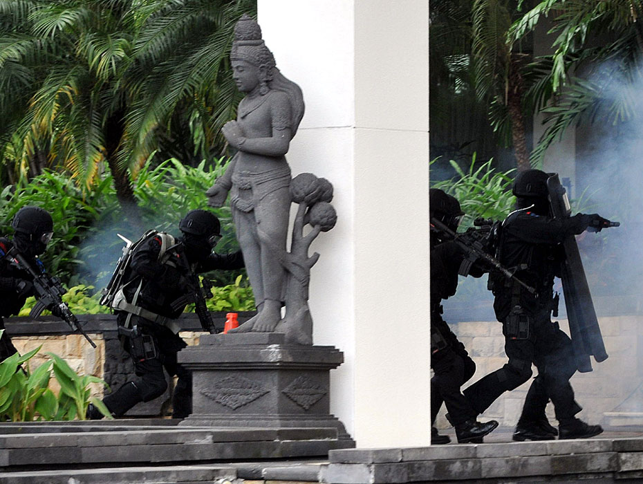 3月13日,印尼警方在首都雅加達(dá)的證券交易所舉行了一場反恐演習(xí),為本月底即將到訪印尼的美國總統(tǒng)奧巴馬創(chuàng)造安全的環(huán)境。圖片來源:中國新聞網(wǎng)