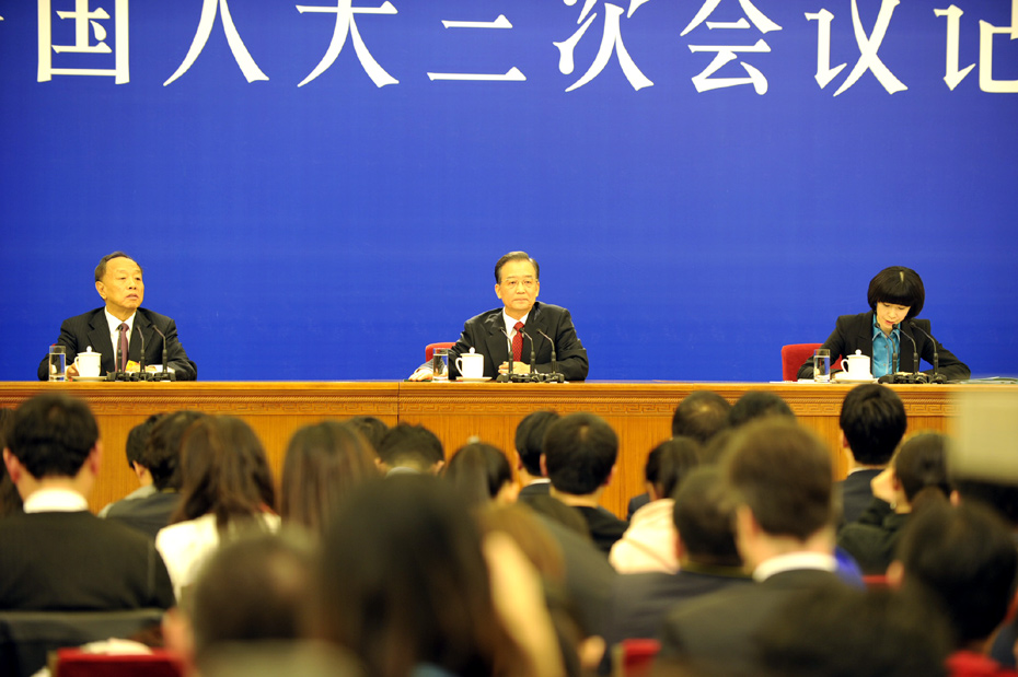 3月14日上午,國(guó)務(wù)院總理溫家寶在人民大會(huì)堂三樓金色大廳與采訪十一屆全國(guó)人大三次會(huì)議的中外記者見面并回答記者提出的問題。中新網(wǎng)記者 楊威 攝 圖片來(lái)源:中國(guó)新聞網(wǎng)