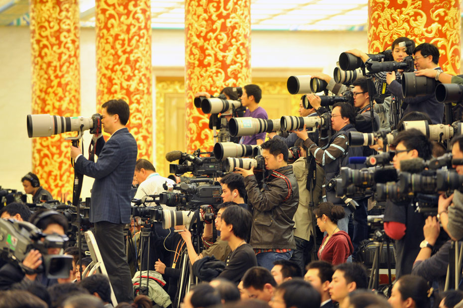 3月14日上午,國務院總理溫家寶在人民大會堂三樓金色大廳與采訪十一屆全國人大三次會議的中外記者見面并回答記者提出的問題。圖為現(xiàn)場記者。中新社記者 賈國榮 攝。圖片來源:中國新聞網