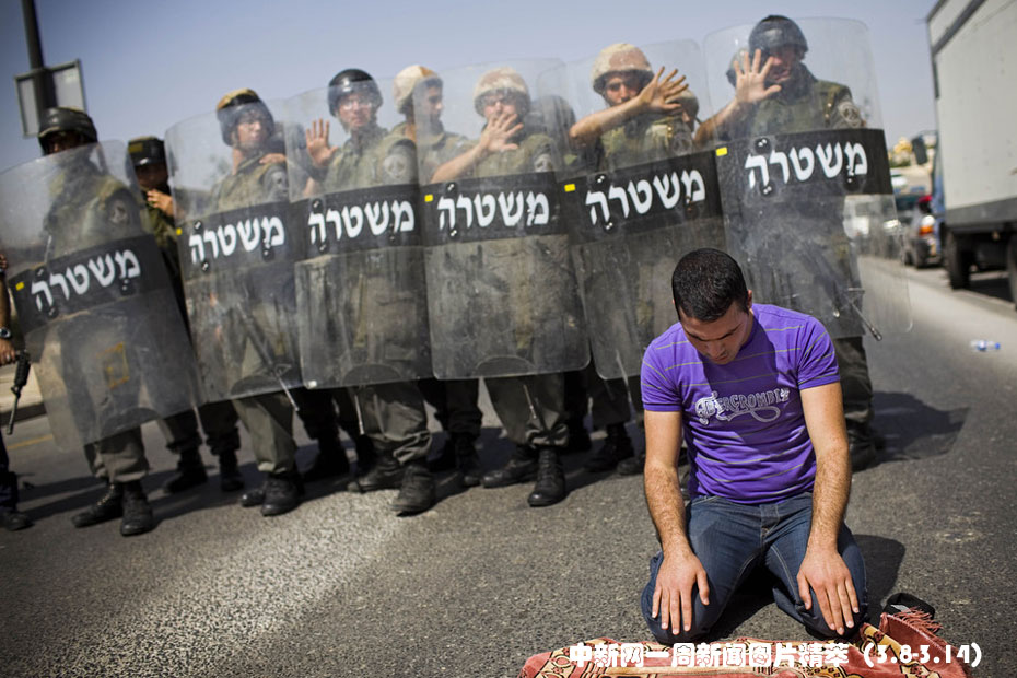 周五,一名巴勒斯坦人在耶路撒冷附近的老城做祈禱,他的身后是以色列軍警組成的人墻。圖片來源:中國新聞網