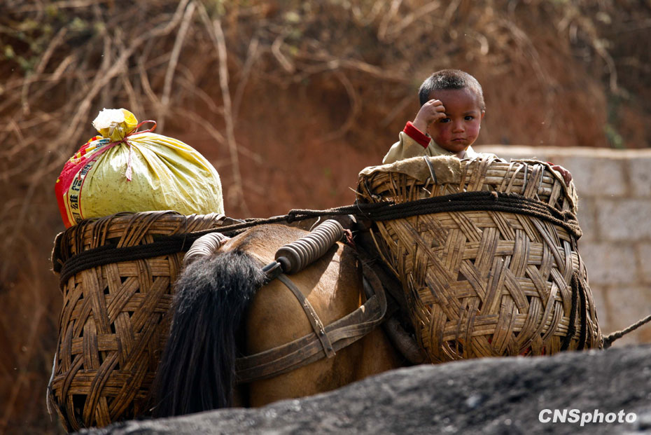 據云南省氣象部門評定,全省綜合氣象干旱重現期為80年以上一遇,其中滇中、滇東、滇西東部的大部地區為百年以上一遇。圖為隨家人外出運水的兒童。中新社發 劉冉陽 攝