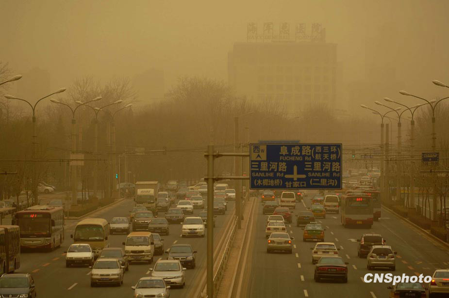 3月20日,春季首場重度浮塵天遮蓋了整個北京城。圖為北京馬路上空浮塵嚴重,帶來交通不便。中新社發 鄒憲 攝