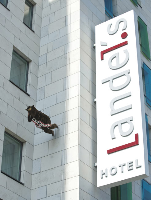 3月18日,在德國柏林舉行的“高樓漫步”活動中,一名女子打扮成熊的模樣(柏林的象征)在天使酒店外墻上行走,參加活動的人都有繩索保護。