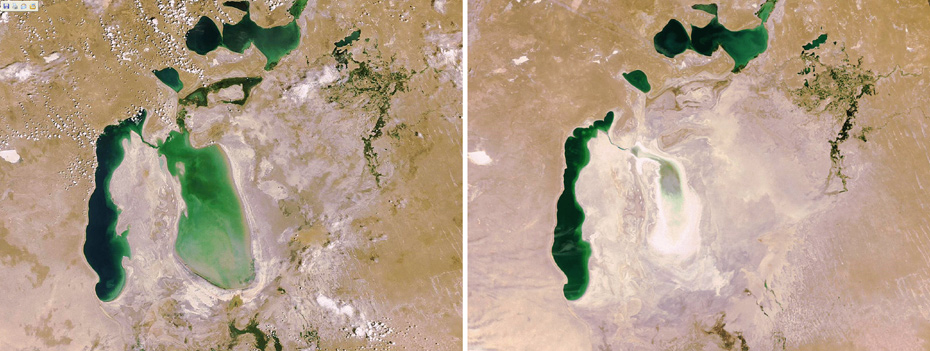 2009年7月10日歐洲航天局公布的照片顯示了號稱世界第四大內陸水體的咸海從06年至09年海岸線急劇回落的過程。咸海的消失其實是人類無度開發利用水資源行為的惡果。