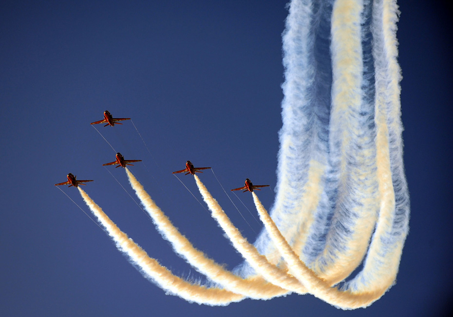圖為英國“紅箭”特技飛行隊訓練的資料圖片。
