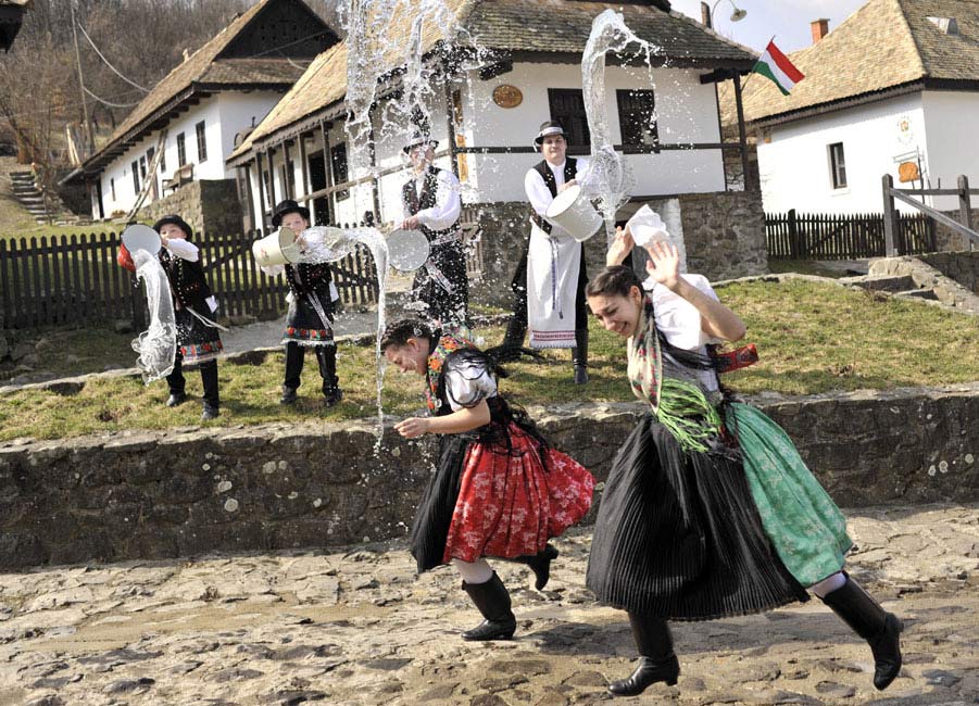 3月26日,在匈牙利首都布達佩斯以東被譽為世界文化遺產(chǎn)的霍洛克村,當?shù)鼐用褚韵蚬媚锷砩蠞娝膫鹘y(tǒng)儀式慶祝復活節(jié)。此項古老習俗起源于公元2世紀。