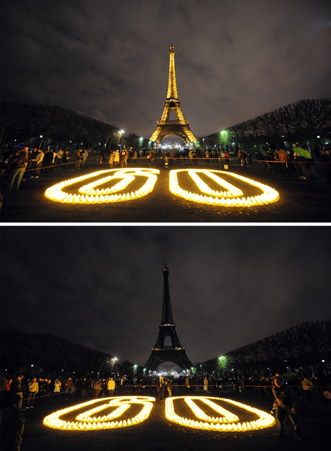 由世界自然基金會發起的“地球一小時”環保活動27日20點30分按照時區依次在全球數千個城市展開。圖為法國巴黎埃菲爾鐵塔熄燈后和亮燈后的照片。