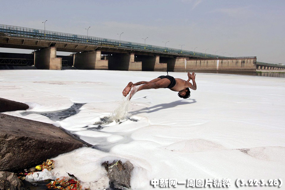 3月22日,新德里一名男子跳進遭到污染的亞穆納河。有關官員稱,工廠無視法規傾倒未經處理的污水和工業廢水,使有毒物質流入河水中。