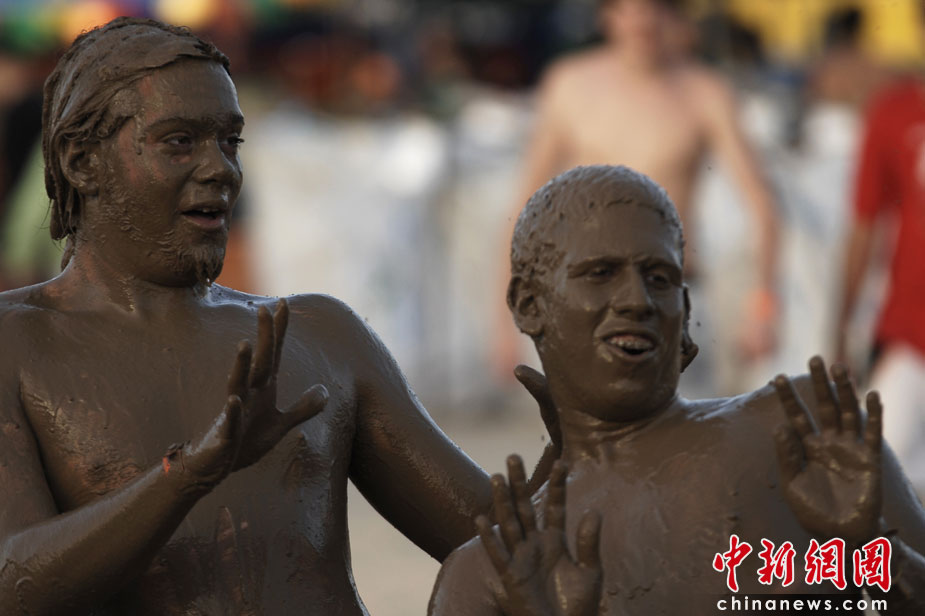 當地時間4月1日,以色列南部的海灘上,眾多年輕人在泥漿中盡情玩耍,慶祝為期三天的逾越節。圖片來源:中國新聞網