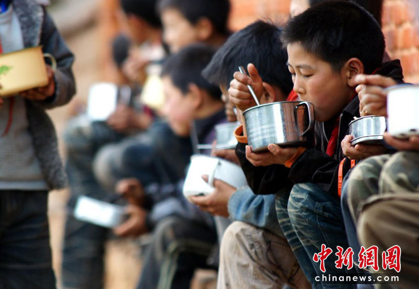 孩子們吃飯時都不喝水喝湯,干旱已讓他們適應了這樣的生活。沙浪 攝