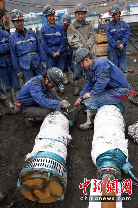 3月29日上午,山西華晉焦煤有限責(zé)任公司王家?guī)X煤礦透水事故搶險(xiǎn)工作正在緊張進(jìn)行中。為救援被困礦工,多方支援的搶險(xiǎn)器材、礦山救護(hù)隊(duì)已經(jīng)陸續(xù)抵達(dá)現(xiàn)場(chǎng)。圖為即將組裝完畢的水泵。中新社發(fā) 張?jiān)?攝