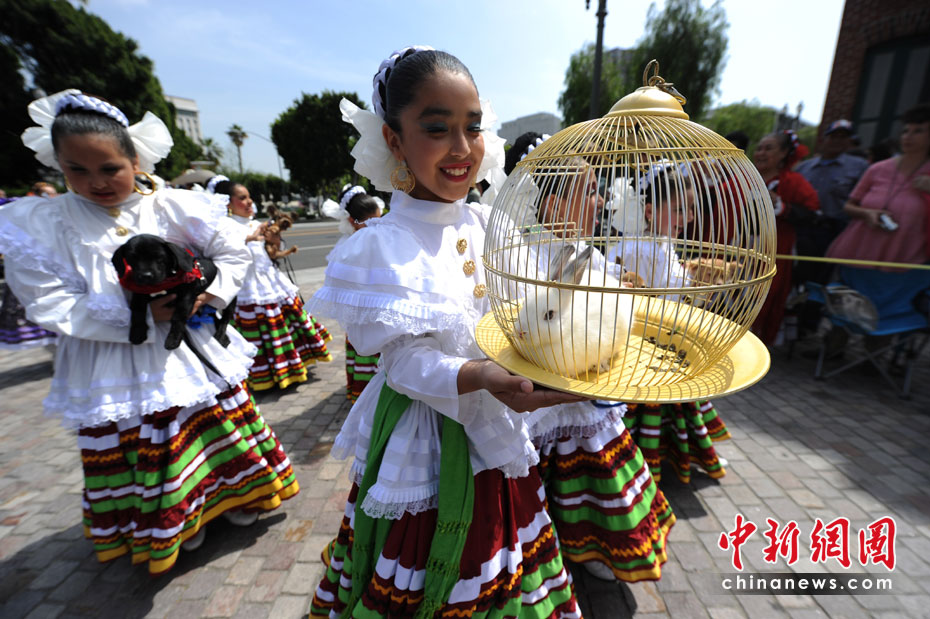 當地時間4月4日,美國洛杉磯人們在歡慶復活節的同時,也為他們的寵物舉行了祝福儀式。這項祝福儀式每年舉行一次。圖片來源:中國新聞網