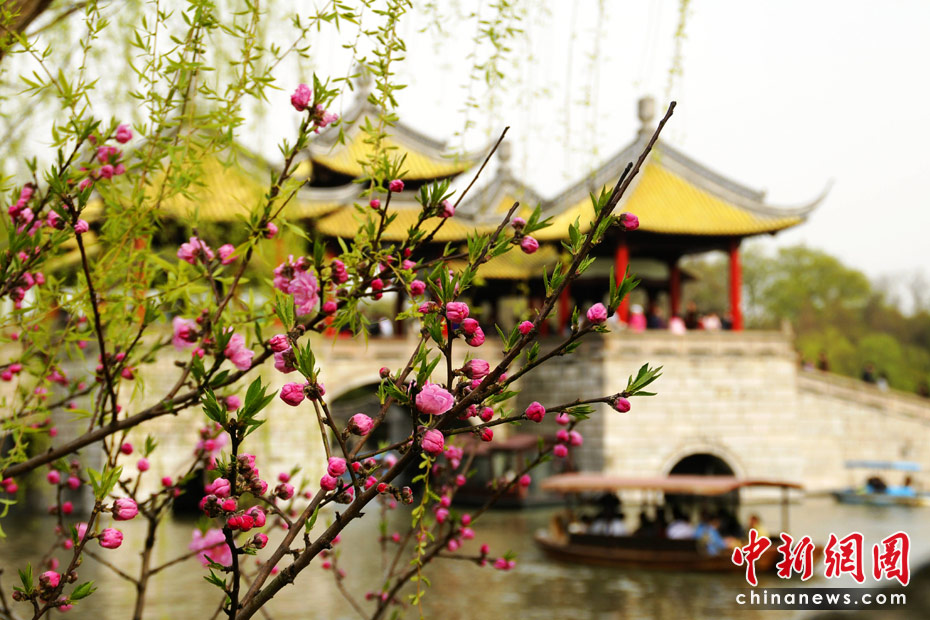 明媚的春光下,古城揚(yáng)州已到桃紅柳綠時(shí)。清明假期,水、柳、花構(gòu)成的揚(yáng)城美景,每天都讓數(shù)萬游客陶醉其中。中新社發(fā) 潘多拉 攝
