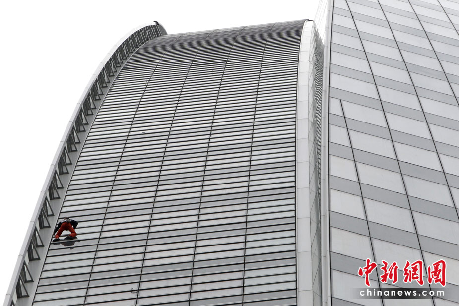 4月7日,巴黎,法國(guó)“蜘蛛人”羅伯特當(dāng)日用了大約50分鐘成功攀爬185米高的法國(guó)燃?xì)馓K伊士集團(tuán)大樓。 圖片來(lái)源:中國(guó)新聞網(wǎng)