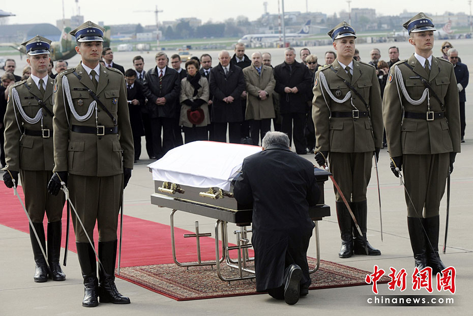 4月10日,卡欽斯基乘坐專機從華沙飛往俄羅斯斯摩棱斯克市,參加卡廷森林事件70周年紀念活動。途中飛機在斯摩棱斯克“北方”軍用機場附近降落時失事,共造成包括卡欽斯基夫婦及眾多政府高官在內的96人死亡。慘劇發生后,舉世震驚。圖為卡欽斯基的孿生兄弟在遺體前跪拜。