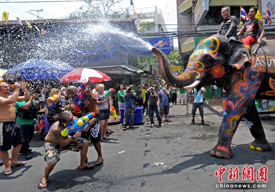 4月12日,泰國迎來一年一度的潑水節,在拷桑路旅游區人們用水槍與大象“互噴”希望為對方送上祝福同時慶祝泰國新年。圖片來源:中國新聞網