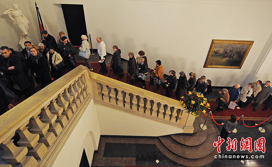 當地時間4月13日14時,波蘭總統夫婦的遺體被安放在總統府最大的圓柱廳供民眾瞻仰和悼念。總統卡欽斯基及其夫人的葬禮將于18日舉行。圖片來源:中國新聞網
