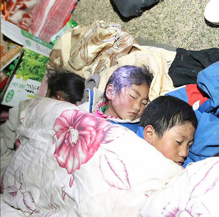 圖為4月14日深夜,幾名受災(zāi)兒童在露天睡覺(jué),他們的父母正在旁邊搭建帳篷。圖片來(lái)源:新華網(wǎng) 丁林?jǐn)z
