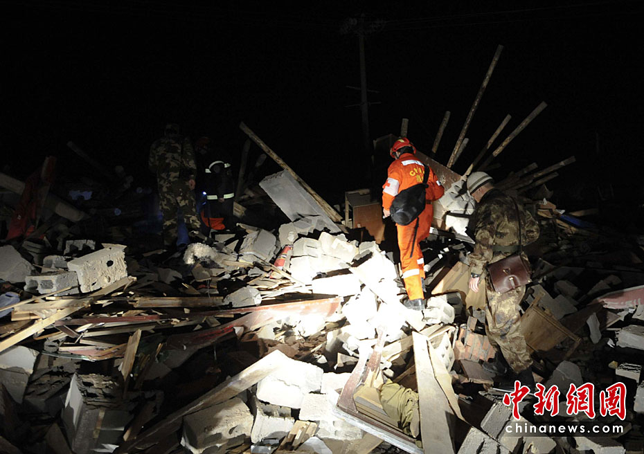 圖為4月15日凌晨1時(shí),武警玉樹州支隊(duì)?wèi)?zhàn)士和中國(guó)國(guó)際救援隊(duì)隊(duì)員一起搜救被困民眾。中新社發(fā) 廖攀 攝