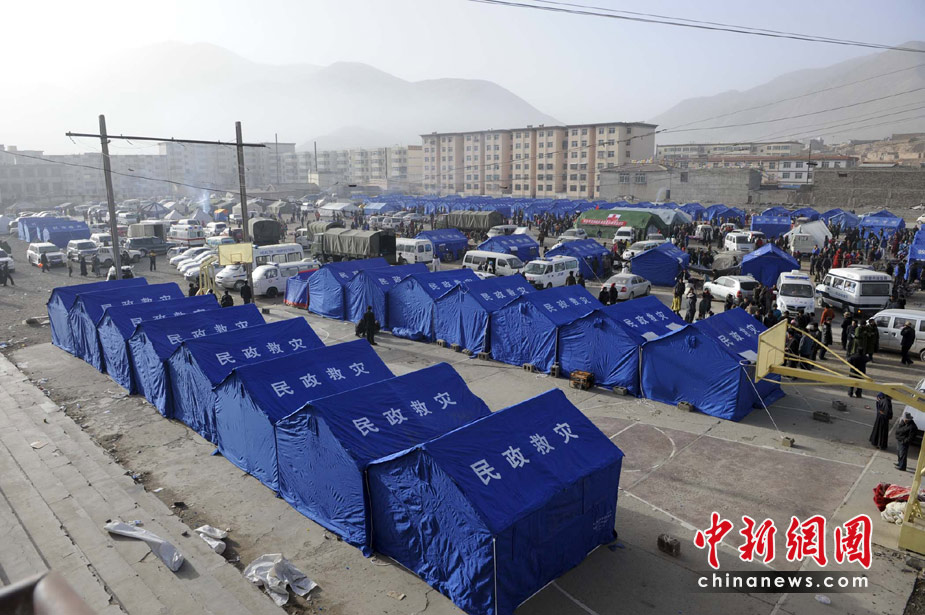 4月15日,青海玉樹縣體育場的地震災(zāi)民安置點帳篷林立。目前青海省玉樹州“4·14”地震造成的死亡人數(shù)已上升至589人,10萬災(zāi)民需要需要轉(zhuǎn)移安置。中新社發(fā) 廖攀 攝