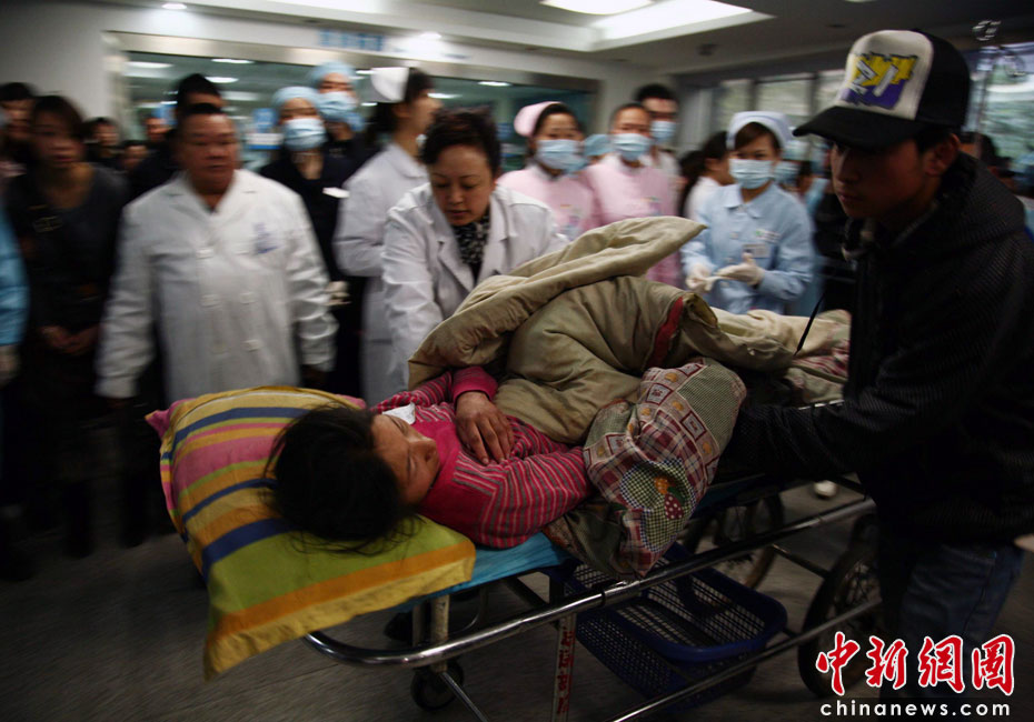 4月15日下午5時40分,首批青海玉樹地震傷員被送往四川省人民醫院進行治療,這批傷員于15日下午5時許隨著中國空軍運輸機抵達成都,每位傷員均有親人、家屬陪同。圖為即將被送進急救中心的地震傷員。中新社發 張浪 攝