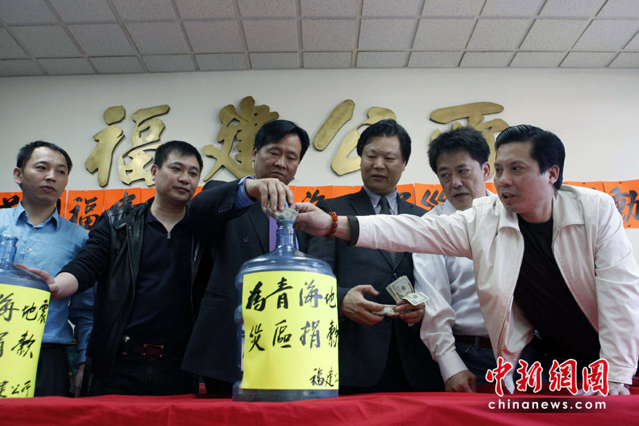 青海玉樹發生地震以來,美國各地的華人華僑齊伸援手,紐約的華人社團聯合總會15日呼吁下屬數百社團為玉樹災區捐款,并在華埠主要街道沿街設立捐款箱。圖為紐約福建公所捐款現場,華人華僑們在不到幾分鐘的時間內,就為青海玉樹災區捐款近5000美元。中新社發 魏晞 攝