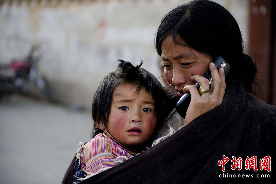 圖為4月15日,青海玉樹縣體育場的地震災民安置點內,一位抱著小女兒的母親在與親人通話時潸然淚下。中新社發 廖攀 攝