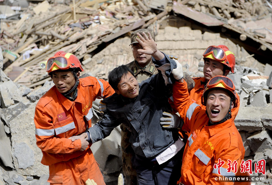 圖為4月15日12時,一位幸存者被中國國際地震救援隊在青海玉樹縣結古鎮西北牛賓館廢墟中救出,他微笑著揮動手臂。中新社發 廖攀 攝