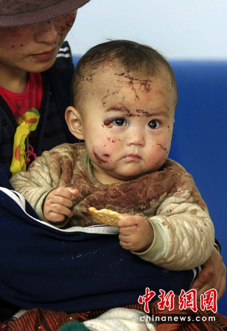 圖為4月15日,青海玉樹巴塘機場,受傷的孩子等待轉運至西寧等地治療。青友 攝