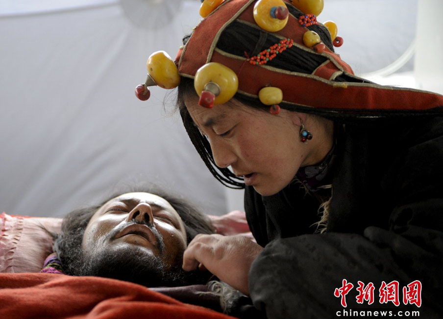 4月16日,青海玉樹體育場武警醫院醫療隊的帳篷里,東周丹增的妻子陪護丈夫接受治療。東周丹增在地震中肋骨骨折。 中新社發 廖攀 攝