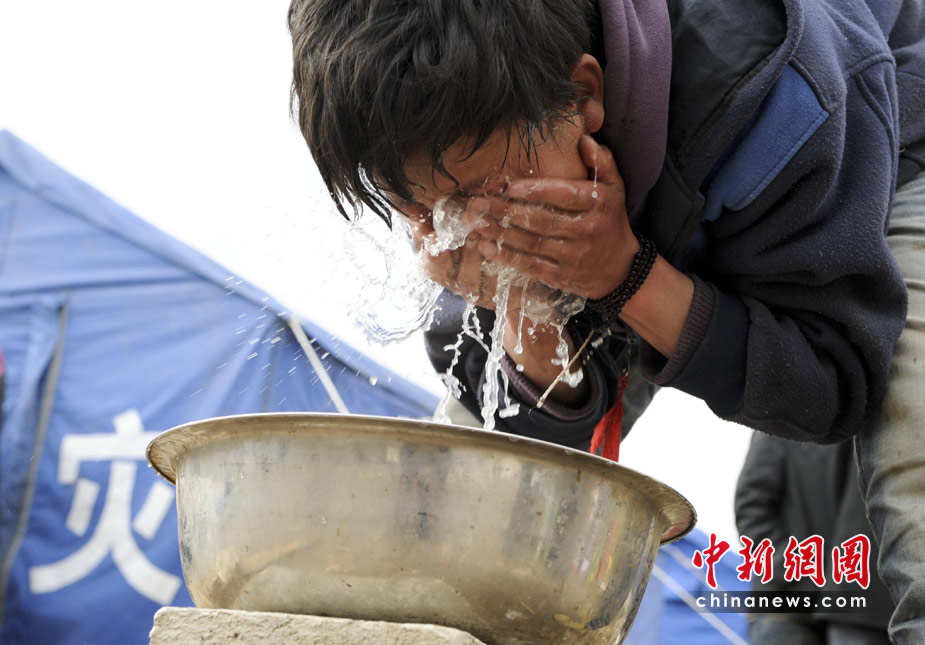 4月16日,青海玉樹體育場地震受災民眾安置點,一位居民用清水洗臉。隨著救災物資的到位,受災民眾生活得到基本保障。 中新社發 廖攀 攝